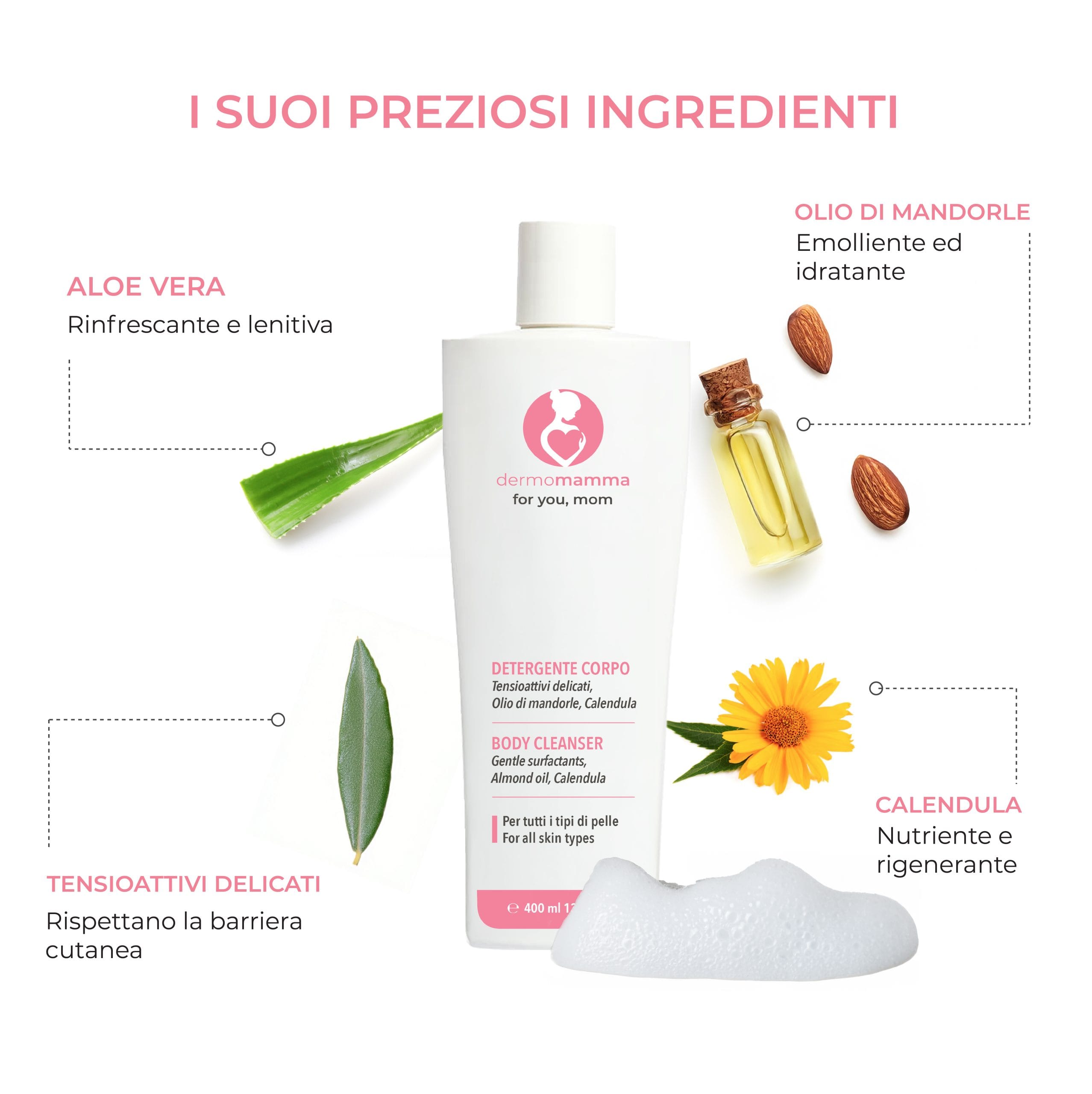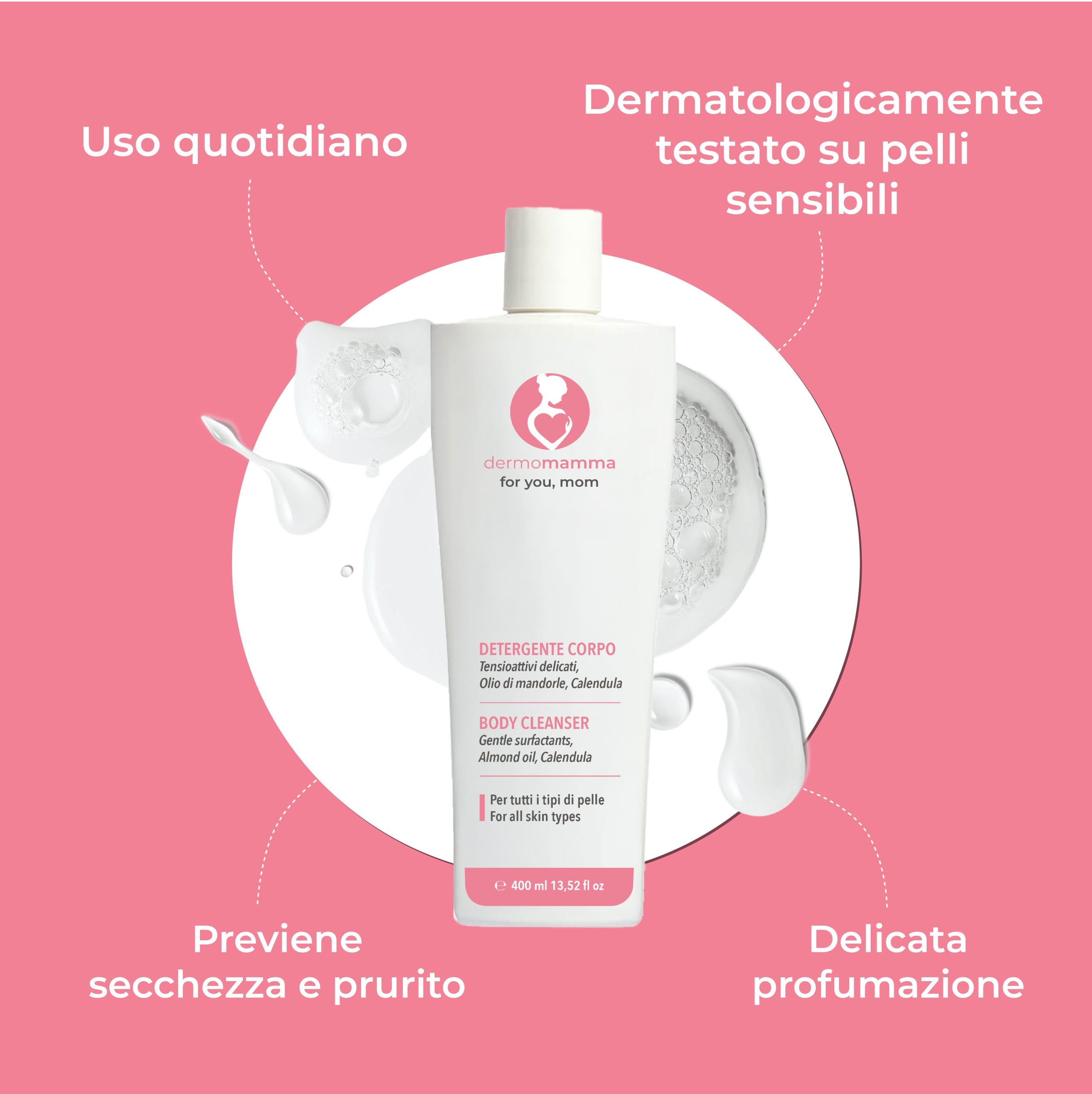 Detergente corpo delicato, formulato con ingredienti naturali per rispettare l’equilibrio cutaneo durante la gravidanza e l’allattamento. Indicato per la pelle sensibile, aiuta a contrastare la pelle secca in gravidanza e dona comfort già dalle prime settimane. A pH fisiologico, nutre e protegge lasciando la pelle morbida dopo la doccia. Dermatologicamente testato. Sicuro anche in fase di allattamento.