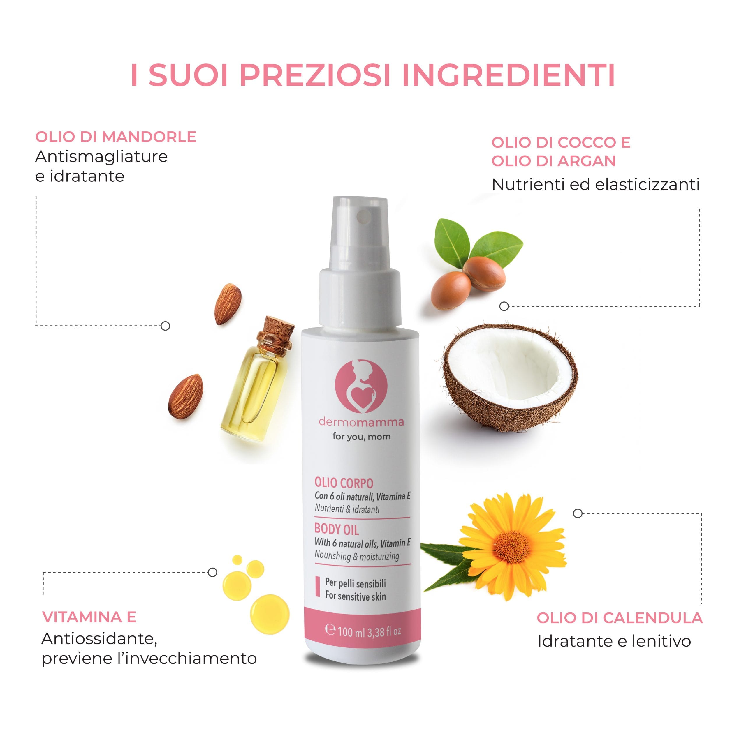 Indicato come olio corpo per gravidanza e olio per allattamento, questo trattamento è perfetto per chi desidera una formula naturale, efficace e pratica. Grazie al suo tocco asciutto, può essere applicato anche poco prima di vestirsi. Aiuta a mantenere la pelle elastica e idratata su pancia, fianchi e seno. È un valido alleato nella prevenzione delle smagliature gravidanza e nella cura quotidiana della pelle, anche nei momenti più delicati.